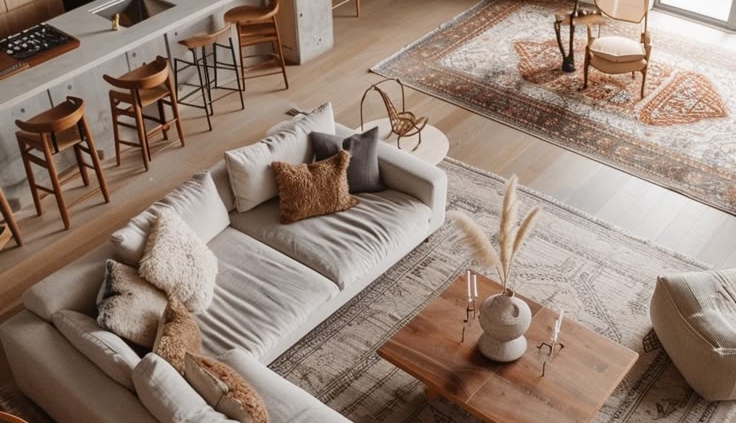 در خانه های مینیمالیستی، چیدمان باید به گونهای باشد که فضاهای خالی حس آرامش و تعادل ایجاد کنند. برای این منظور: